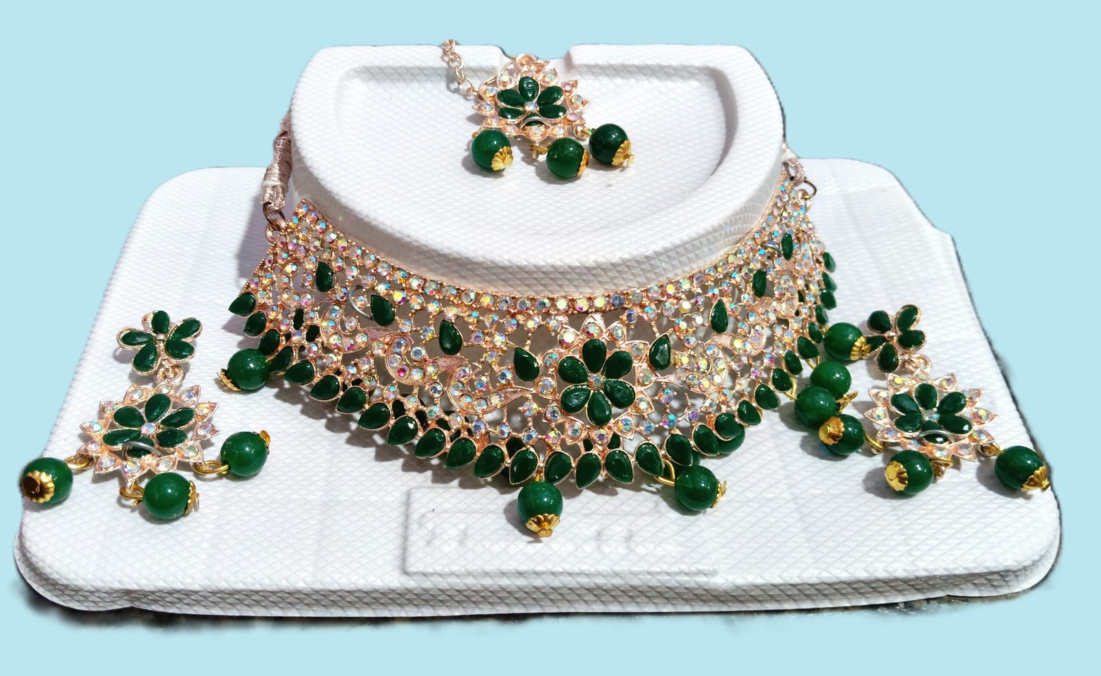 Enhance your style with this exquisite gold-plated necklace featuring intricate detailing and a dazzling green stone centerpiece. The sparkling white stones complement the design, creating a perfect balance of elegance and glamour. Lightweight and easy to wear, this necklace is ideal for weddings, celebrations, or traditional events. Pair it with matching earrings to complete the look and radiate timeless beauty.